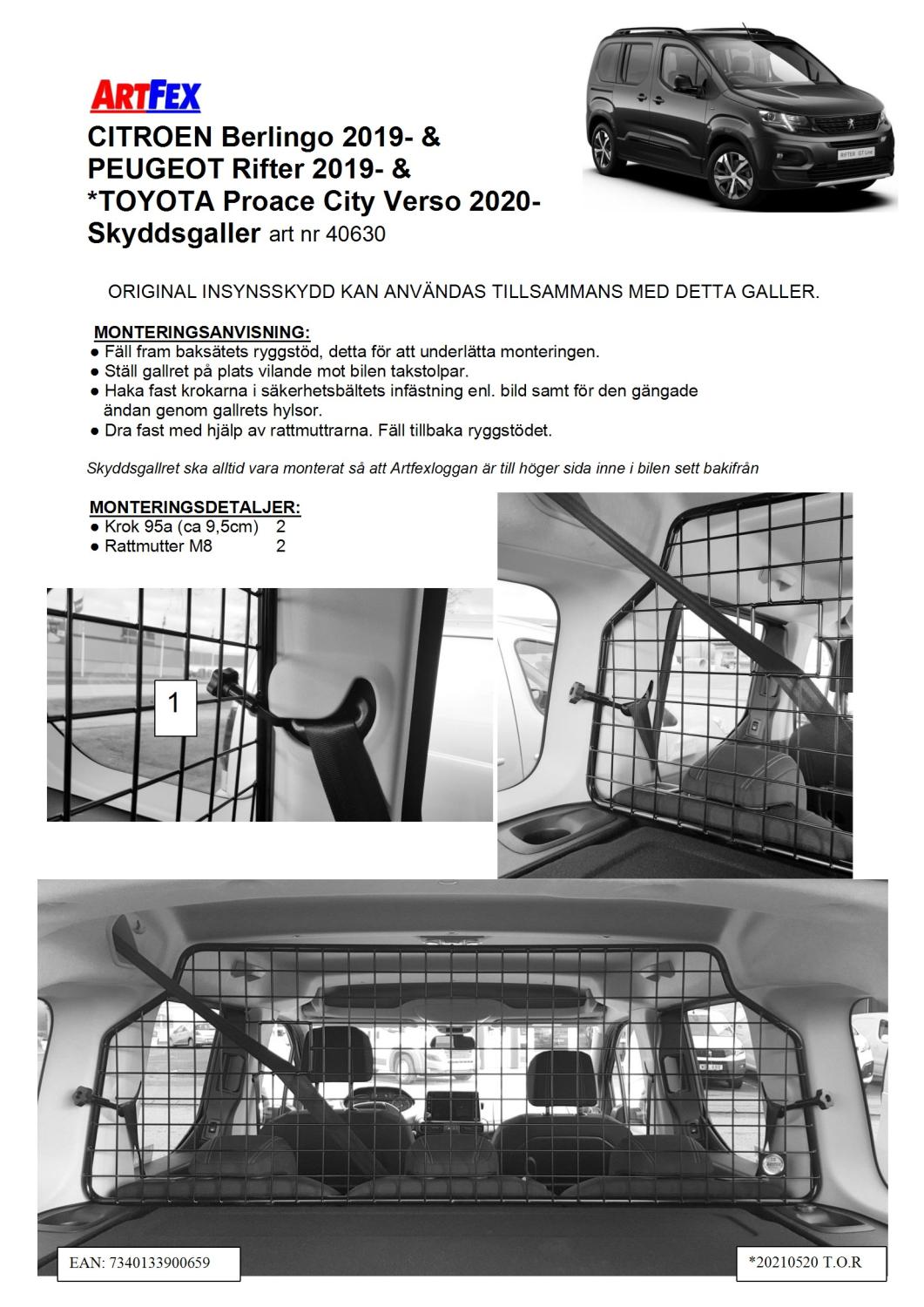 Artfex Lastgaller, även kallar Skyddsgaller, till Toyota Proace City Verso 2020-, Citroen Berlingo 2019-, Peugoet Rifter 2019-