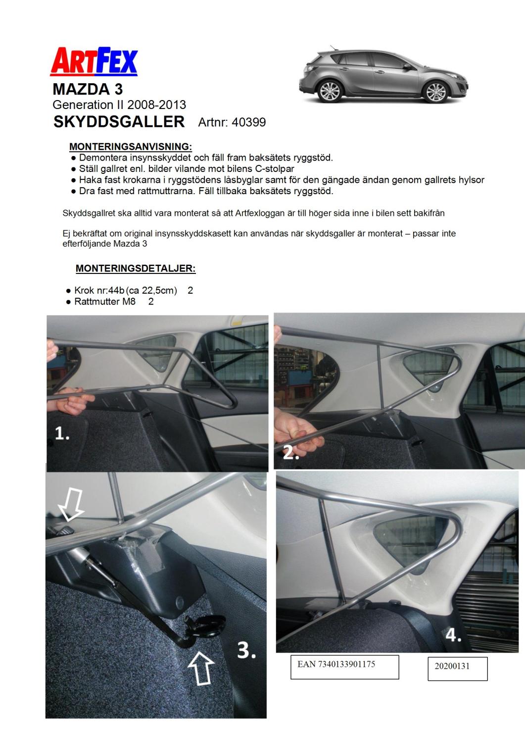 Modellanpassat Artfex Lastgaller, även kallat Skyddsgaller Mazda 3 2008-2013 (halvkombi)